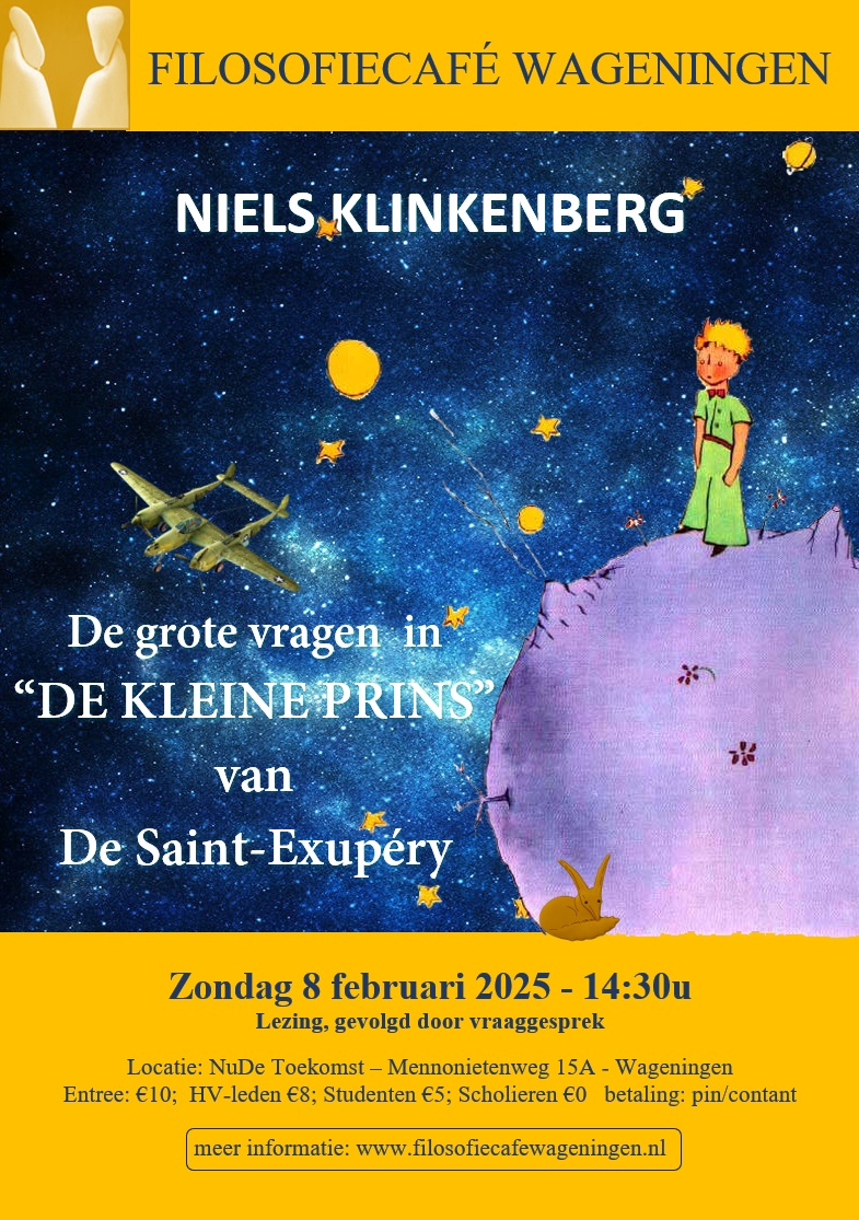 Wat op het eerste gezicht een eenvoudige, poëtische fabel lijkt, blijkt bij nadere lezing een diepzinnig filosofisch werk te zijn, vol vragen over mens-zijn, verantwoordelijkheid en verbondenheid. In deze lezing neemt Niels Klinkenberg u in mee in het leven en het denken van Saint-Exupéry.